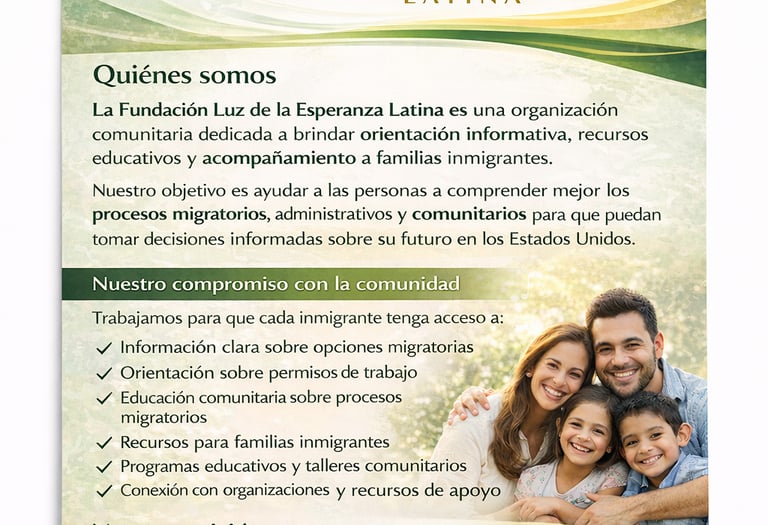 Somos una fundación que guía y apoya a inmigrantes latinos en EE.UU., brindando recursos educativos y comunitarios.